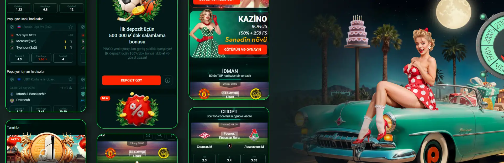 Heç bir anket və yoxlamalar tələb olunmur. E-mail, telefon, şifrə daxil edirsən və artıq oyundasan. Pinco online sistemi ilk depozit üçün bonusu dərhal verir, buna görə bu fürsəti qaçırma.